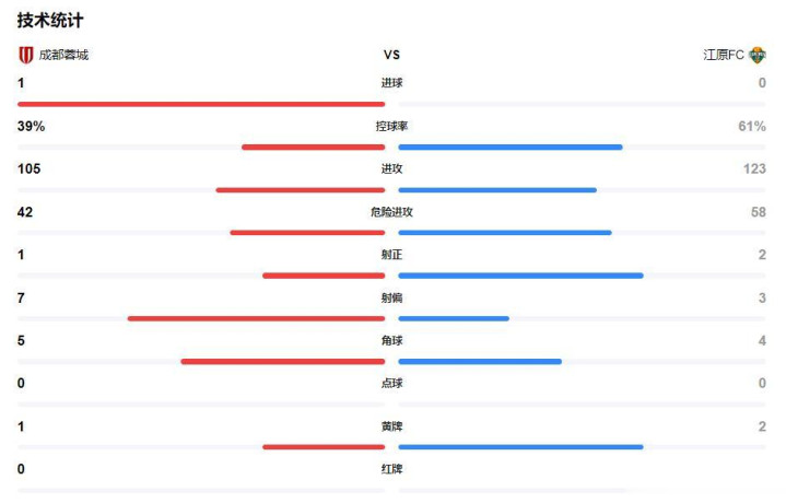 从技术统计看,江源FC占据了控球上的优势,进攻方面的数据也占据优势,但两者相差不大。反映在场上的局势上,成都蓉城在进球后,以防守为主。