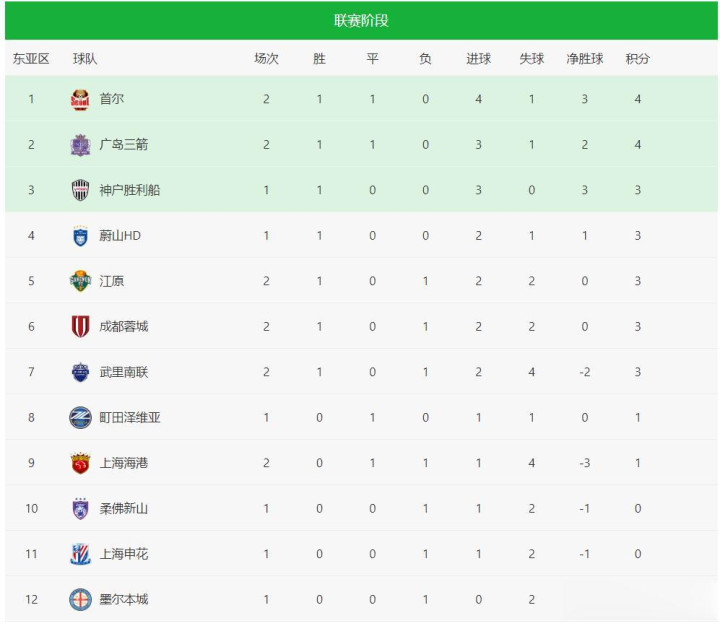 这样,今晚出战的两支中超球队成都蓉城和上海海港取得了一胜一平的成绩,而中超另一只劲旅上海申花对阵蔚山现代的比赛将在明晚进行。截止目前,亚冠精英东亚赛区积分榜如下: