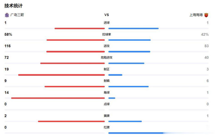 从技术统计来看,广岛三箭占据了场上的优势,尤其是有威胁的进攻远多于上海海港,但总体来说双方的差距并不大,1-1的比分也比较合理。